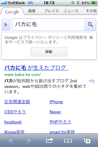 検索結果TOPが特徴的で、その他検索(「画像」「動画」とか)が横並びの配列なのでその部分が覆われてしまっています。