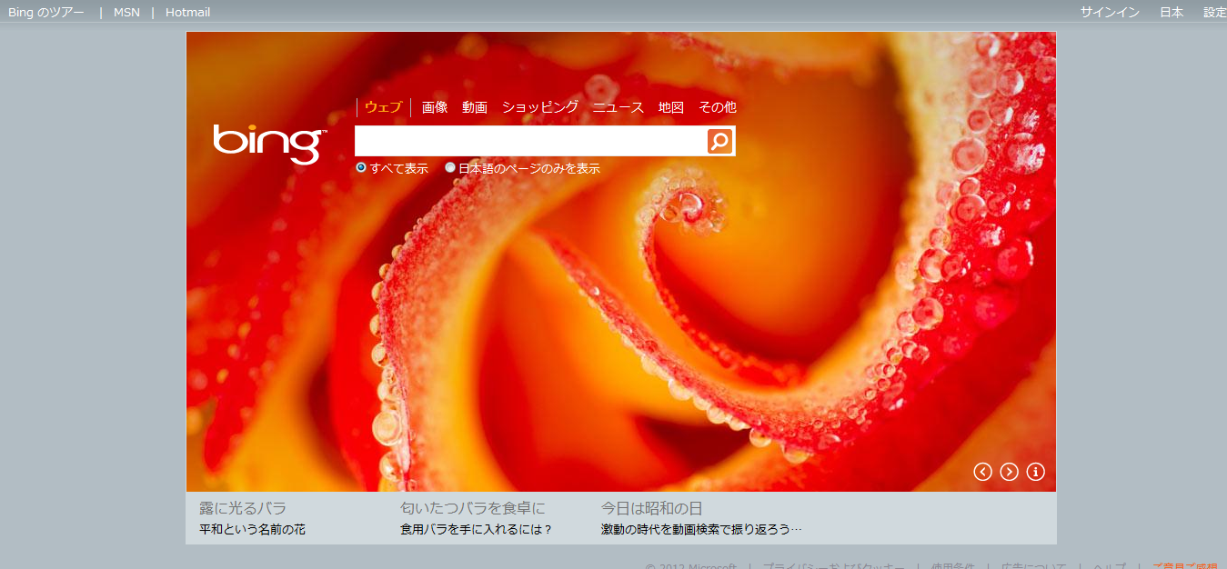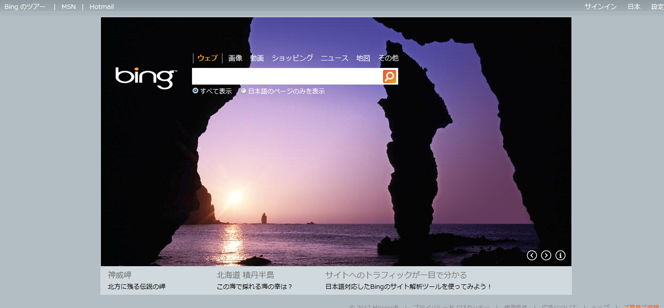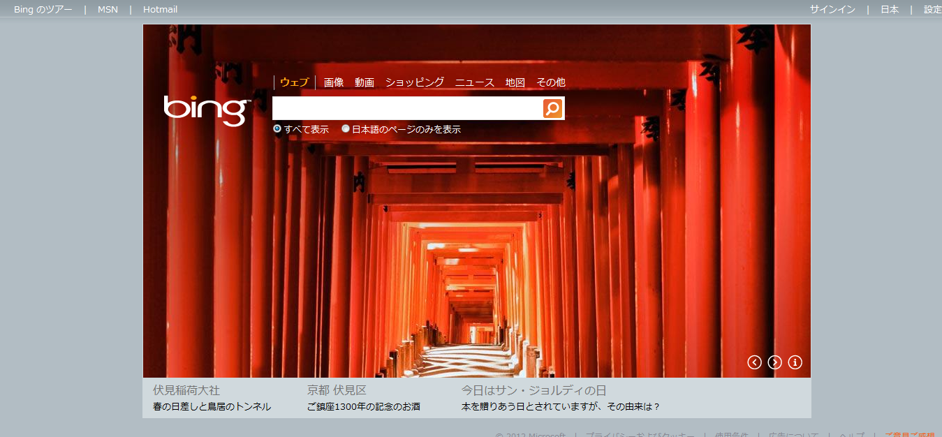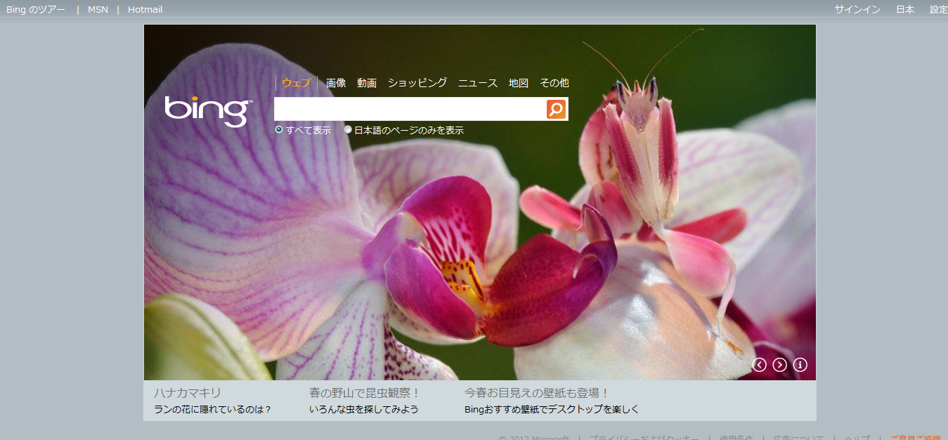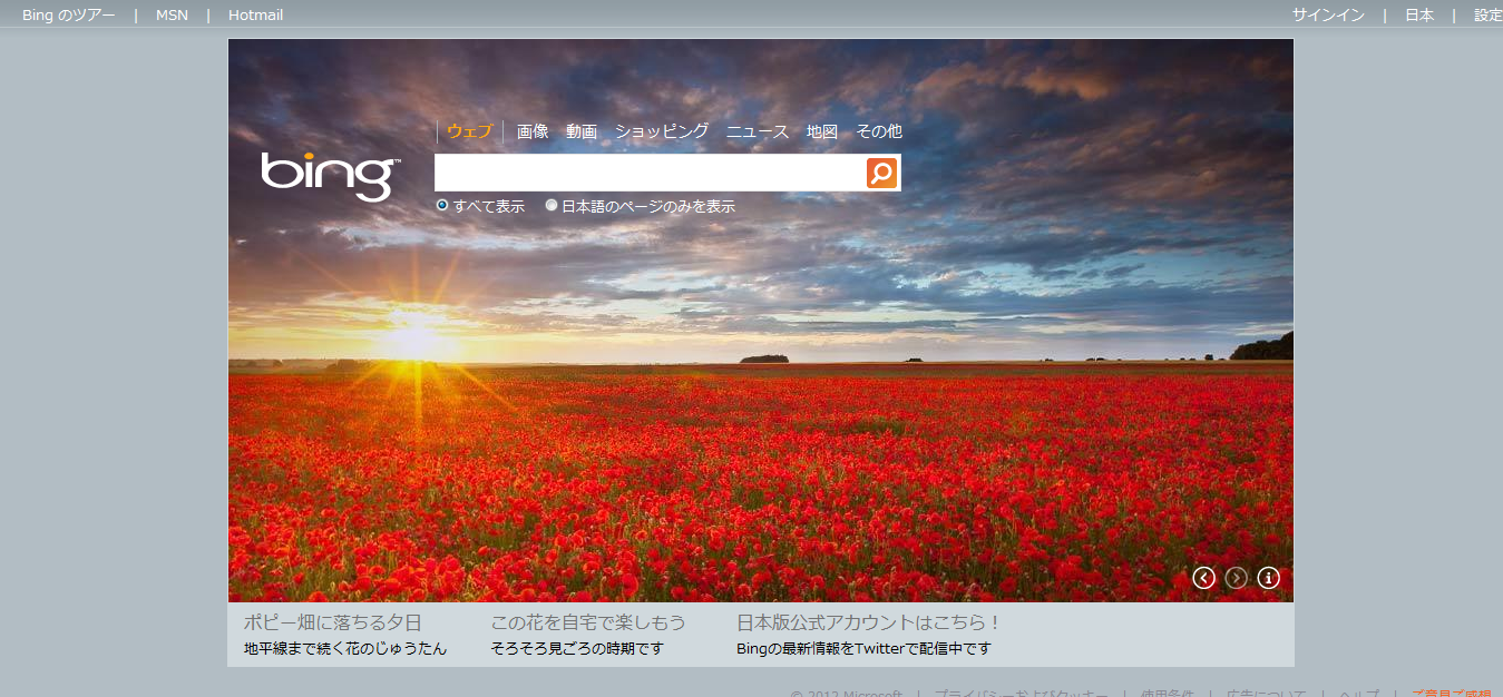 先週のBing(4/23~4/29)背景画像まとめ Bing X Facebook はてブ Pocket LINE コピー 2012.05.07 「先週の」というか「先々週の」となってしまいましたが更新。 気が付いたらゴールデンウィークも終わっているという時間の早さよ。 2012.4.23-4.29 4/23 「伏見稲荷大社」 4/24 「ゲイツヘッド・ミレニアム橋」 4/25 「ポピー畑」 4/26 「石垣島」 4/27 「神威岬」 4/28 「ハナカマキリ」 4/29 「露に光るバラ」 今週も美しい画像を見て頑張って行きましょう! Bing 先々週(4/16~4/22)のBing背景画像まとめ