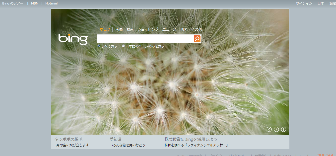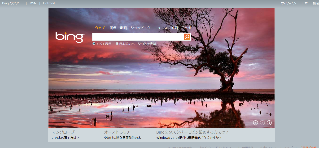 【自然風景特集】先週のBing(5/14~5/20)背景画像まとめ Bing X Facebook はてブ Pocket LINE コピー 2012.05.23 というわけで先週分など。 2012.5.14-5.20 ※クリックすると拡大します。 5/14 「セントピーターズバーグ」 5/15 「タンポポの綿毛」 5/16 「カンヌ港」 5/17 「ガイランゲルフィヨルド」 5/18 「晴海旅客ターミナル」 5/19 「ランズエンド岬」 5/20 「マングローブ」 今回は前週分と比較して自然の風景が多かったですね。 幻想的な風景が多くあるので、実際に一度見てみたいものです。 先々週のBing(5/7~5/13)背景画像まとめ Bing