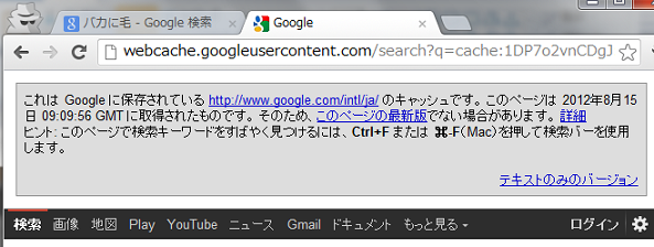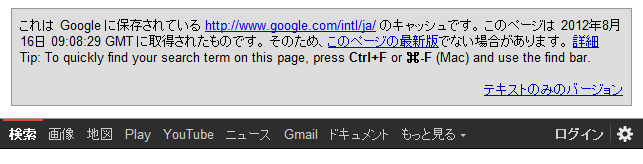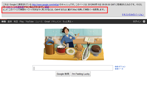 Googleのキャッシュ情報に「ヒント:このページで検索キーワードをすばやく見つけるには、Ctrl+F または ⌘-F(Mac)を押して検索バーを使用します。」という文言が表示されています。