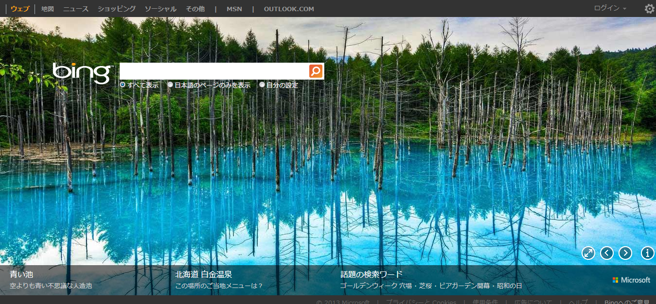 「青い池」に関して自分は知らなかったのですが、Bing背景を見ているとこうした日本にある神秘的な風景にも気付けるからいいですね。