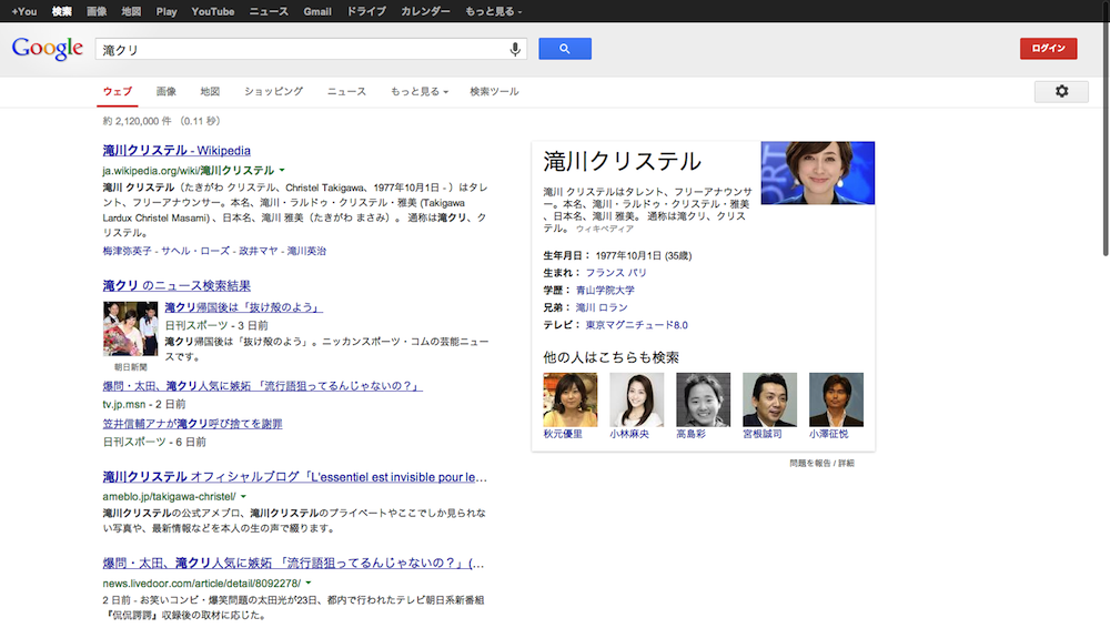 「滝クリ」で検索すると滝川クリステルのナレッジグラフが出てきた。