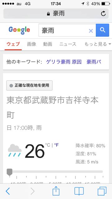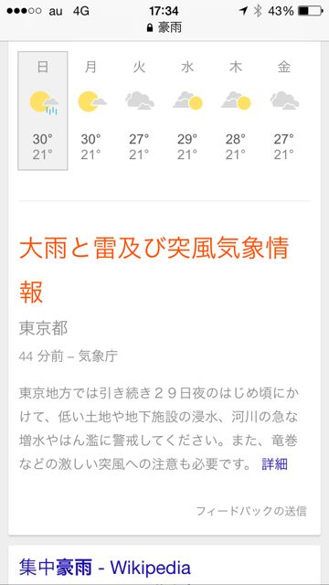 ただし「豪雨」等の検索をすると天気情報が表示されるっぽいです。