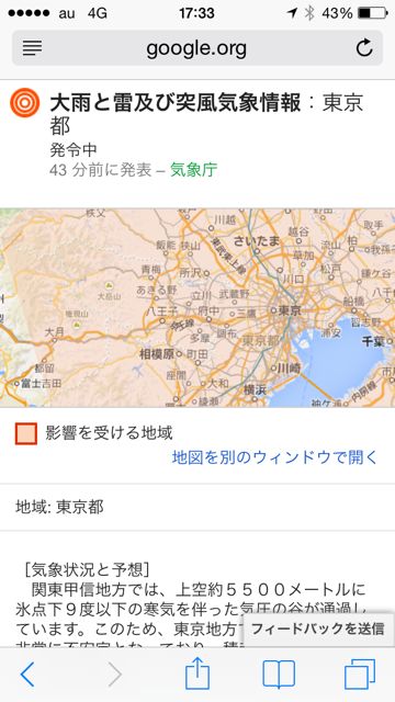 (右)スクロールした画面「大雨と雷及び突風気象情報」(東京都)