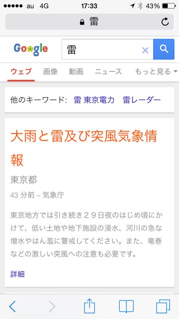 「雷」と検索すると前述の「大雨と雷及び突風気象情報」(東京都)のみ表示。