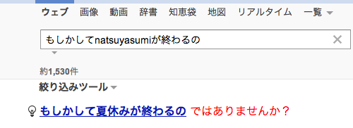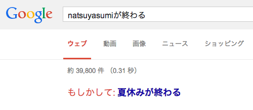 サラリーマンの方にとっては今週から来週あたりが夏休みの終わりだったりするのではないかと思うわけですが、終わりの絶望感を検索エンジンで表現してみたので「あれっ・・・夏休みが・・・終わる・・・!?」(ざわ・・・ざわ・・・)という方はぜひご利用ください。