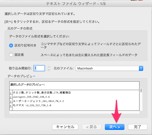 4.新規でエクセルファイルを開いて貼り付け(Command+V)した際に「テキストファイルウィザードを使用する」というのがあるので選択。
