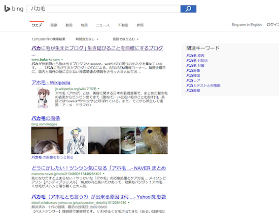 アニメのことを考えるとバカ毛さんを連想してしまい、検索順位がどうなってるかと思ってた調べたらGoogleだと「バカ毛」で羊とwikiに挟まれてるけど、Bingだったら1位だからやっぱBingが一番良い #錯乱 #金曜日のネタ帳
