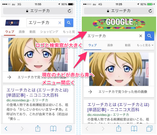 変更点はロゴの大きさを拡大(doodleが見やすくなりました)、検索窓を少し下げ大きめに変化。