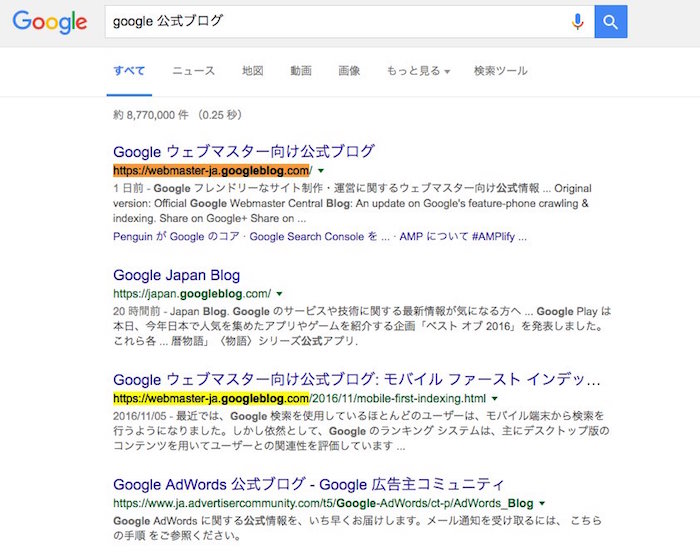 GoogleJapanBlogを挟んでウェブマスター向けブログが2つ表示。