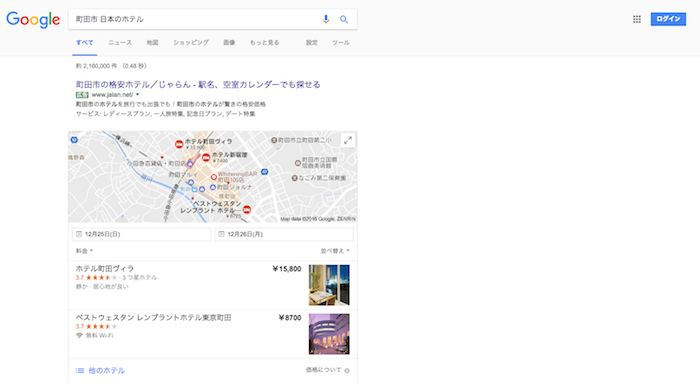 「ホテルを表示」をクリックすると、「町田市 日本のホテル」の検索結果が表示。