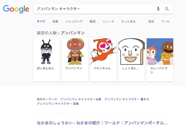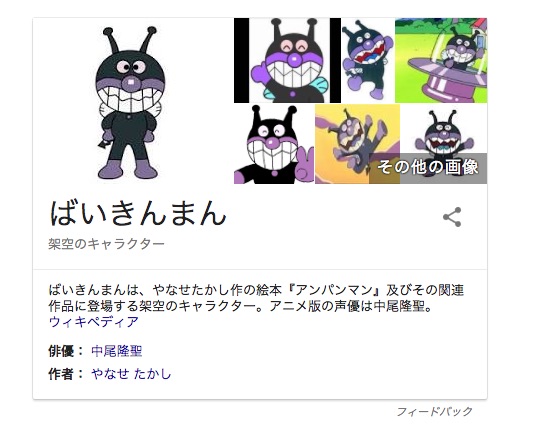 ちなみに「ばいきんまん」単体でもナレッジグラフが表示されます。