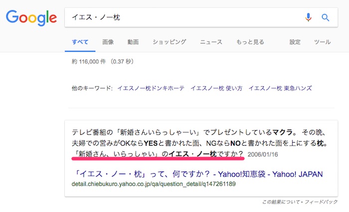 フィーチャードスニペット(答え)「「新婚さん、いらっしゃい」のイエス・ノー枕ですか?」