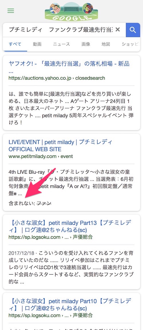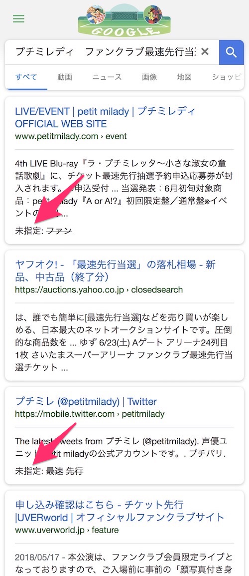 「プチミレディ ファンクラブ最速先行当選」:初回の検索だと「含まれない」表記に