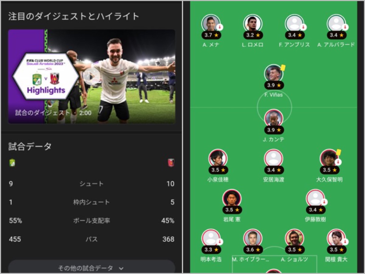 検索結果で表示されるサッカーの試合結果にて、フォーメーションとか選手の評価が表示されているの初見な気がする#金曜日のネタ帳 pic.twitter.com/fqu5x4DJp0