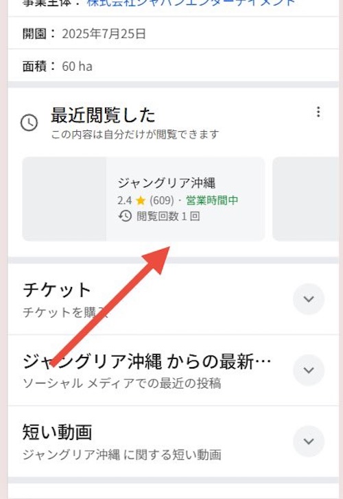 「最近閲覧した」のセクション。Googleビジネスプロフィールの閲覧履歴から表示。ただの閲覧履歴ではなく、KWからジャンルを絞って出してくれている模様です。画像のKWは「ジャングリア」です #金曜日のネタ帳 pic.twitter.com/Kh1BmQR7s5