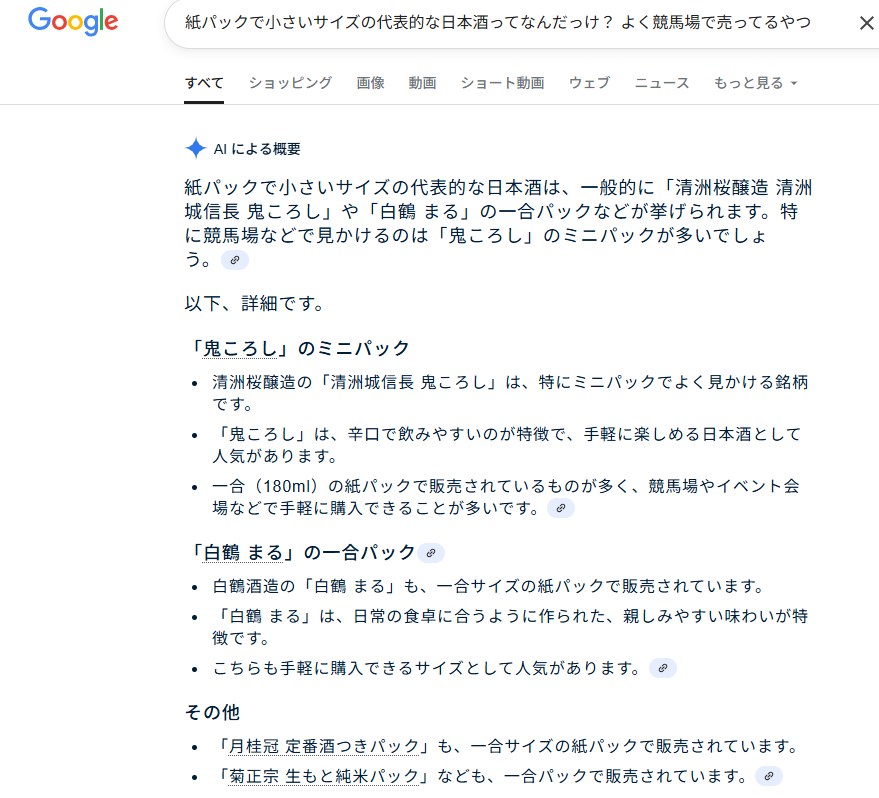 「紙パックで小さいサイズの代表的な日本酒ってなんだっけ? よく競馬場で売ってるやつ」