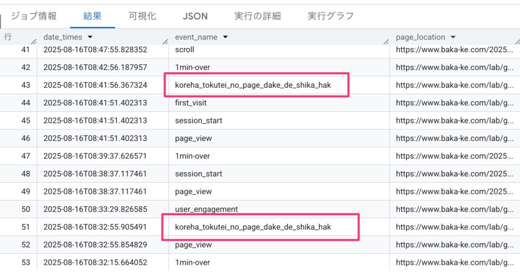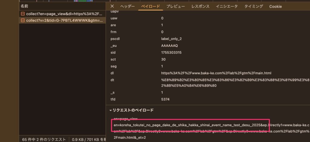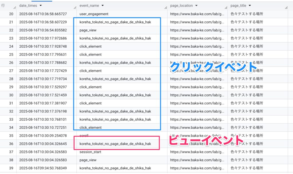 ただ「40文字」という制限がある通り、イベント名としての記録はもともとの「koreha_tokutei_no_page_dake_de_shika_hakka_shinai_event_name_test_desu_2025」(75文字)ではなく「koreha_tokutei_no_page_dake_de_shika_hak」(40文字箇所で切れている)となっています。