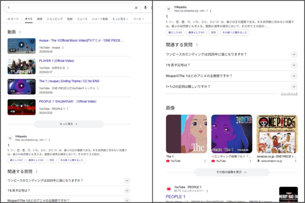 コピペミスで検索したけど「1」の検索結果がこんなに変わってた。画像にワンピース1巻がきているのも興味深い。#金曜日のネタ帳 pic.twitter.com/zWmVM2VDgB