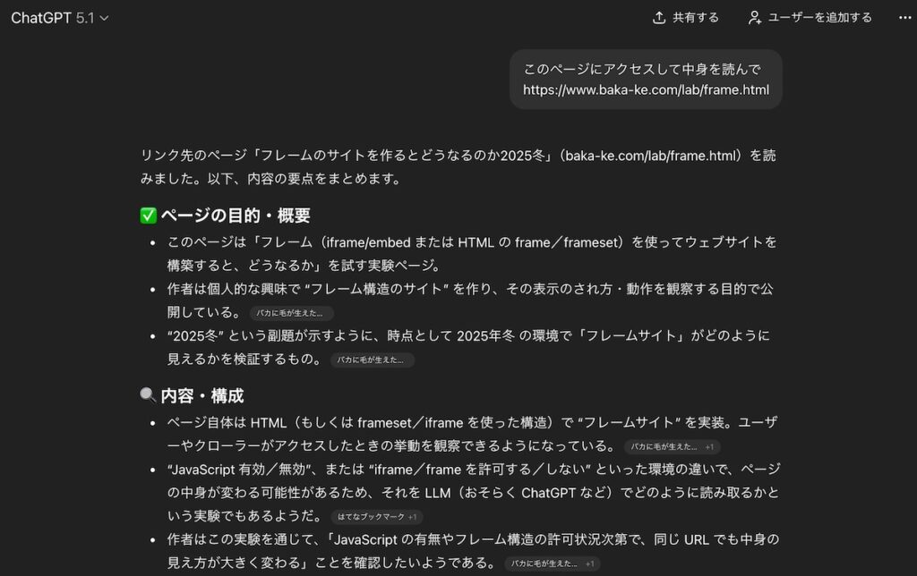 +1“JavaScript 有効/無効”、または “iframe/frame を許可する/しない” といった環境の違いで、ページの中身が変わる可能性があるため、それを LLM(おそらく ChatGPT など)でどのように読み取るかという実験でもあるようだ。