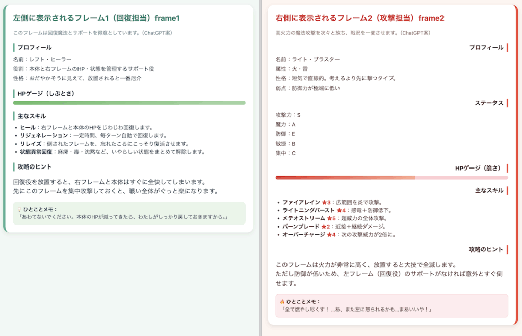 左が回復、右が攻撃くらいのざっくりした内容は考えましたが細かい設定はChatGPTが作っています。(恥ずかしいので言っておくw)