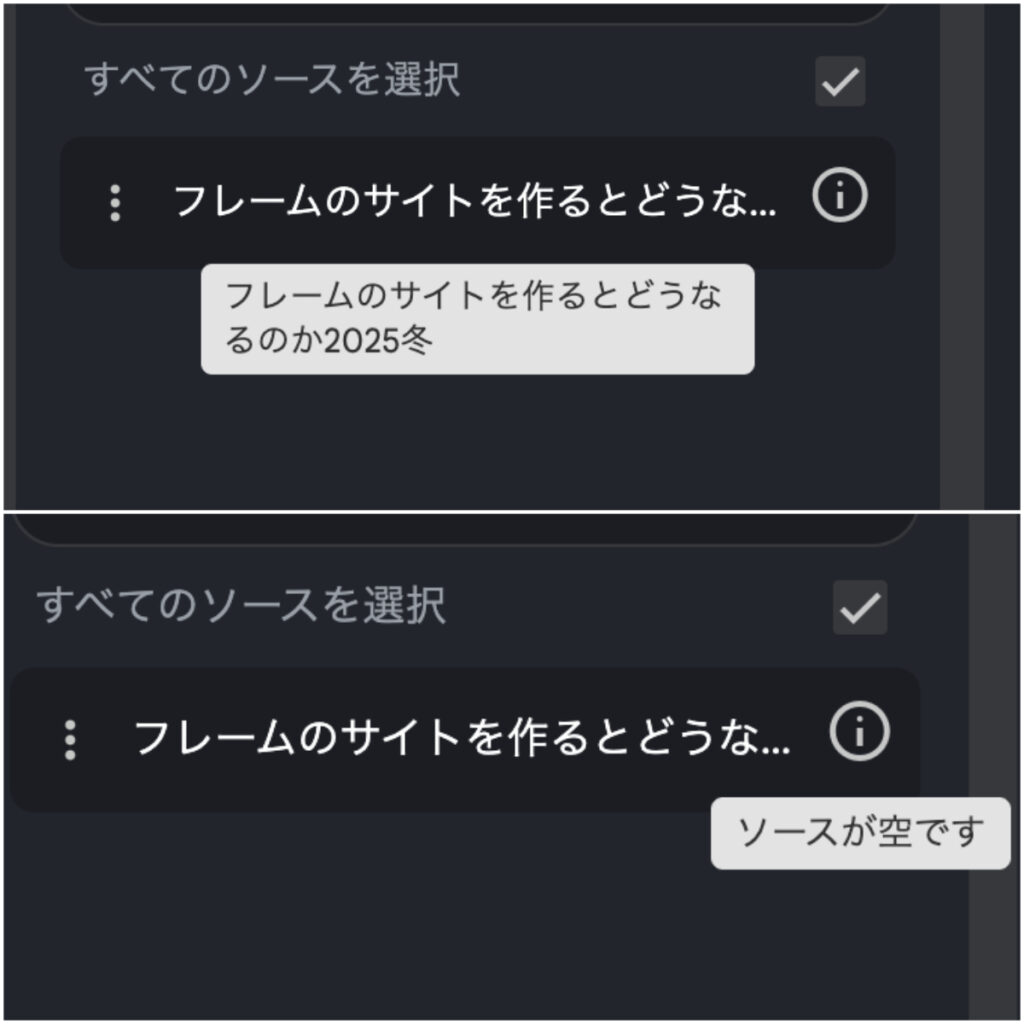 NotebookLM:メインのみ分かるが、別frameの中身が読めない