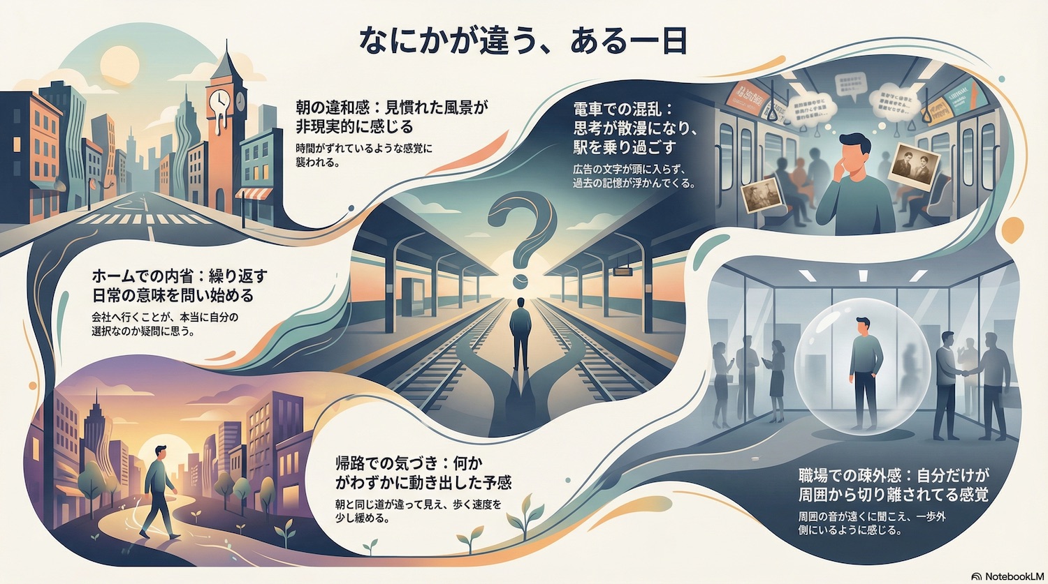 朝、駅までの道を歩きながら、彼はいつもと同じはずの風景に違和感を覚えていました。コンビニの前で立ち話をしている学生も、角を曲がった先の小さな公園も、見慣れているはずなのに、どこか現実味が薄く感じられます。昨夜に特別な出来事があったわけではありませんが、目が覚めたときから、時間が少しずつずれているような感覚がありました。
