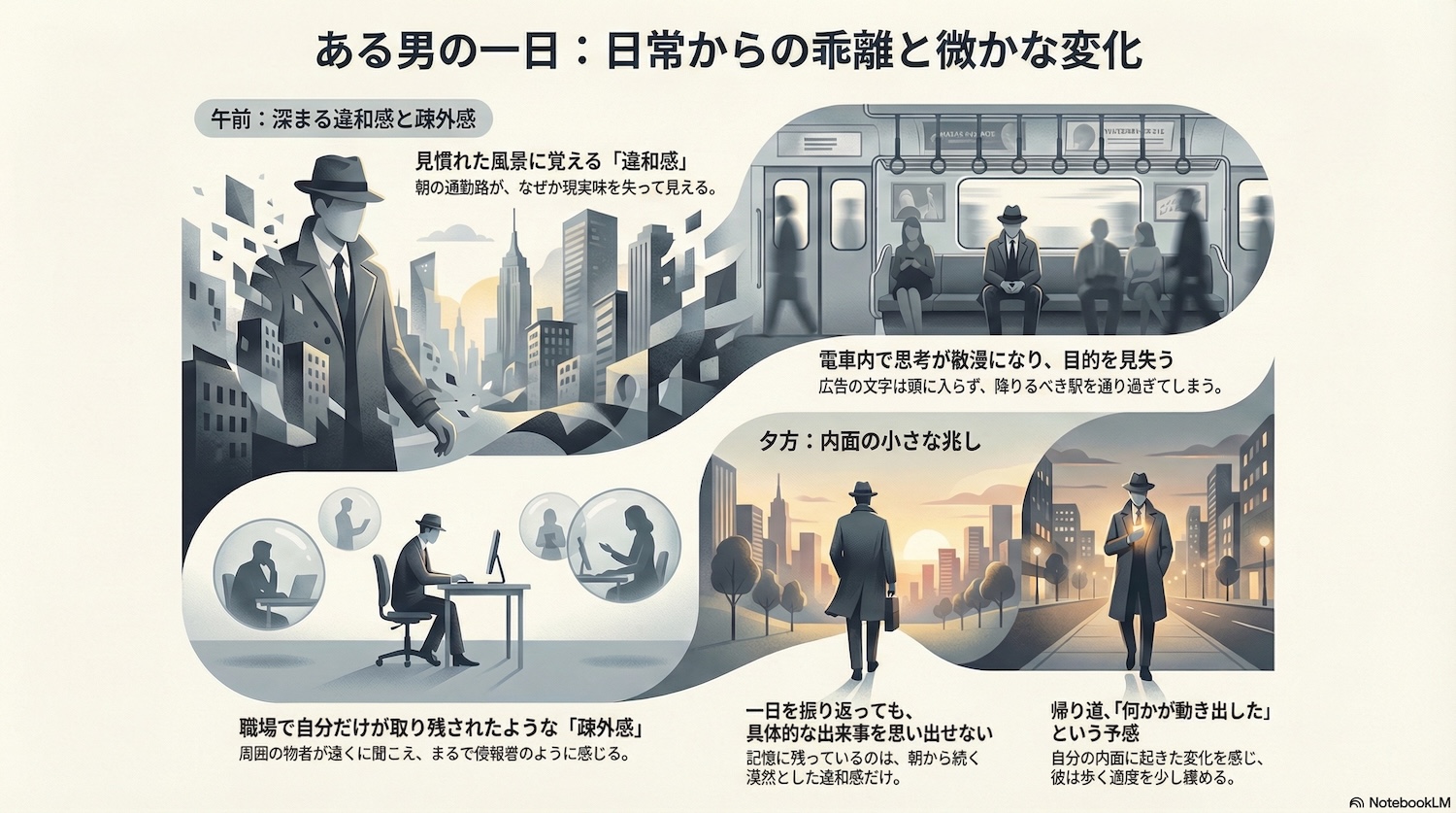 夕方、窓の外が暗くなっていくのを眺めながら、彼は一日を振り返ろうとします。しかし、明確な出来事は思い出せず、朝から続く違和感だけが残っています。帰り道、同じ道を歩きながら、朝とは少し違って見える街を眺めました。その違いが自分の内側にあるのかは分かりません。それでも、何かがわずかに動き出したような気がして、彼は歩く速度を少しだけ緩めました。