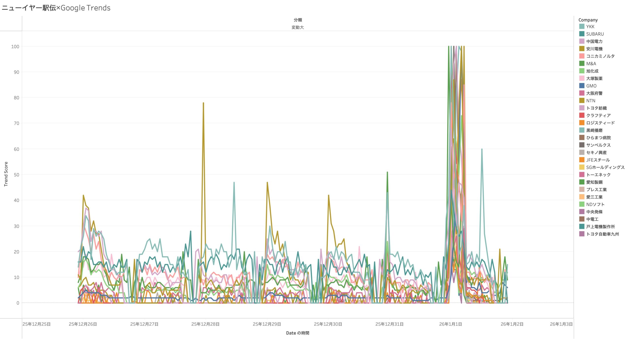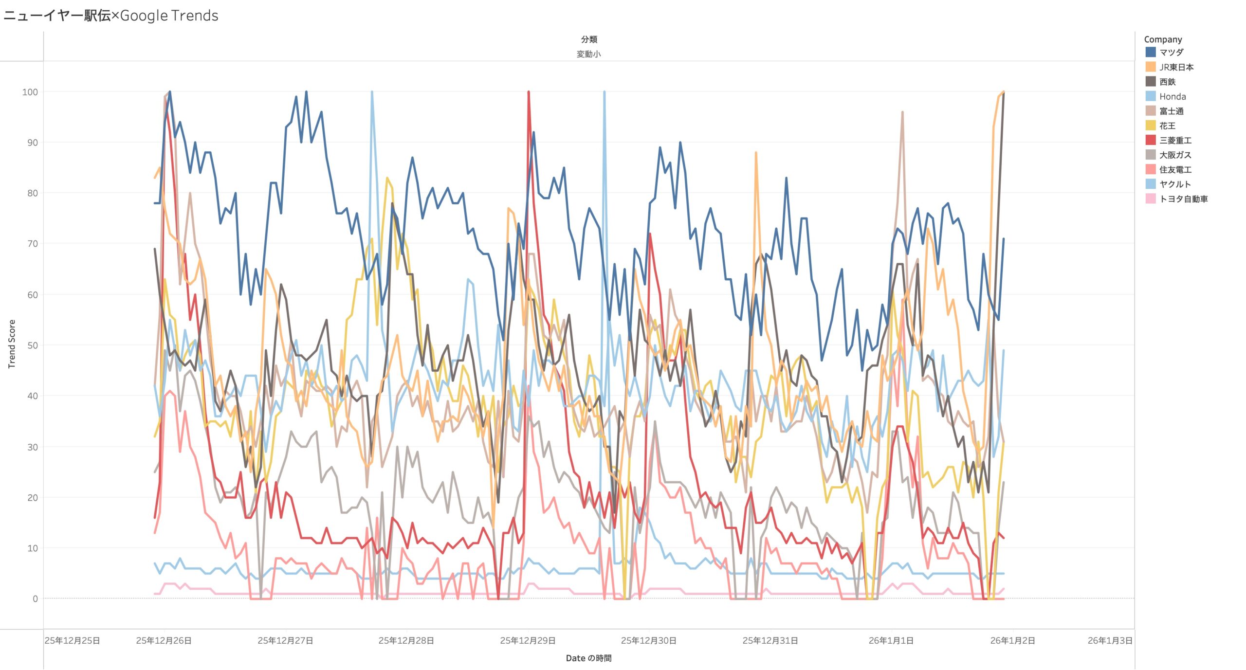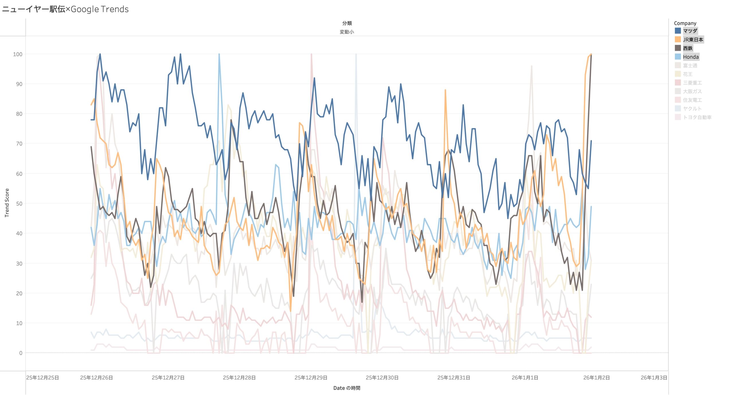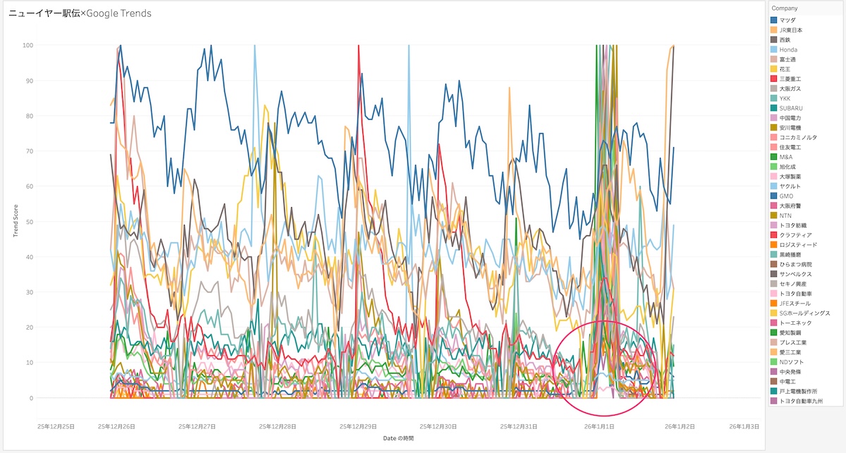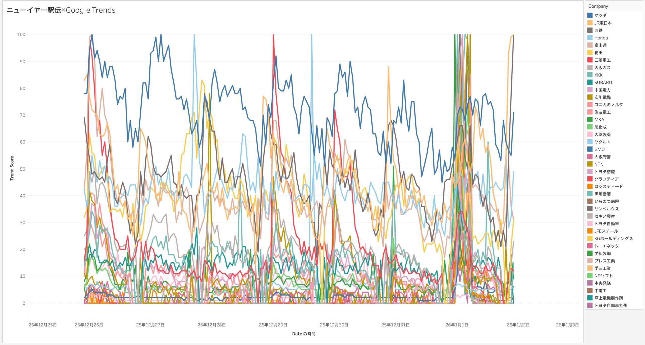 ニューイヤー駅伝を見ながらGoogleTrendsを見ていたりしたのですが、ふと「出場している全企業名で調べたらどんな動きになるのか?」と気になったので調べてみました。