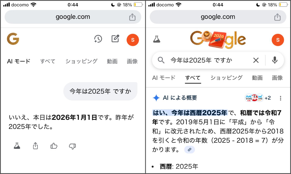 AIモードは年越ししたが、AI Overviewはまだ2025年にいる #金曜日のネタ帳 pic.twitter.com/3nGXrD64tA