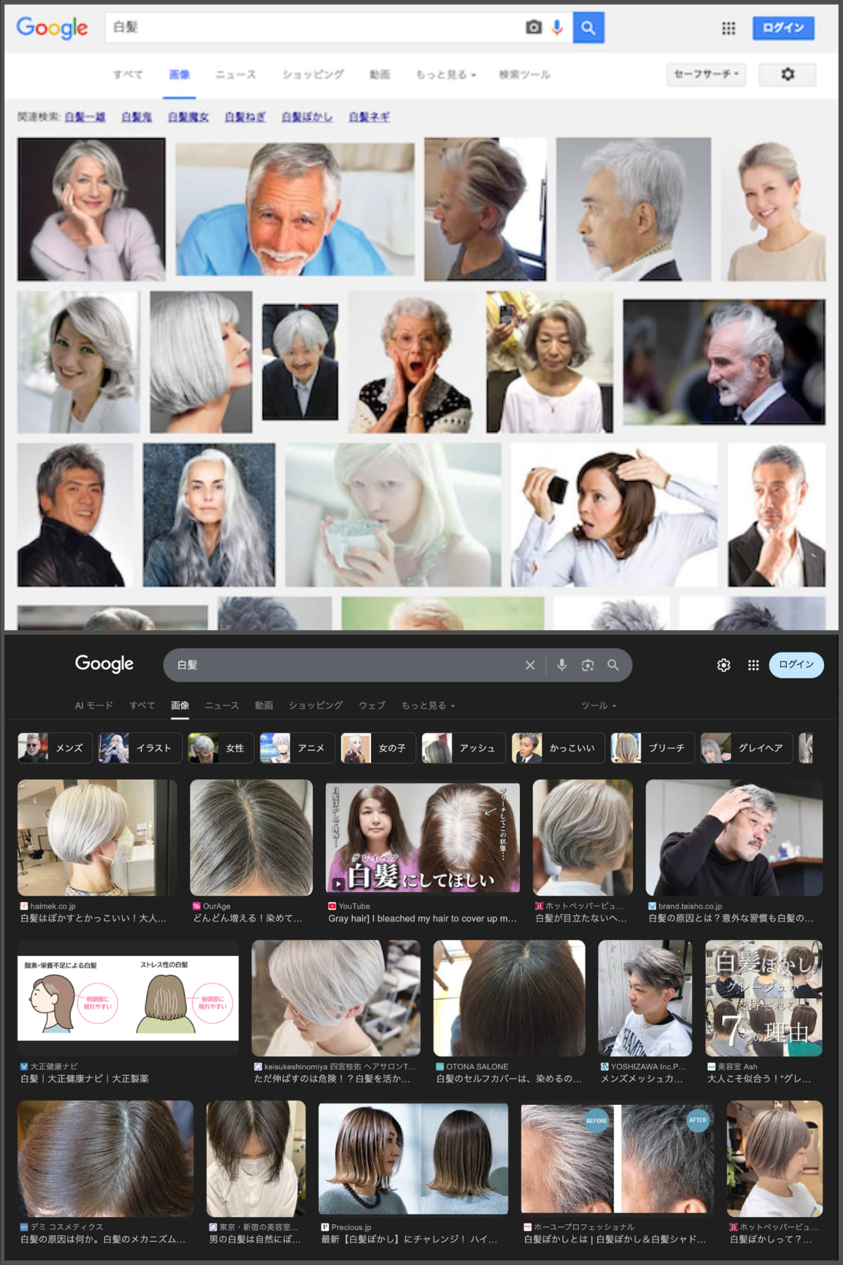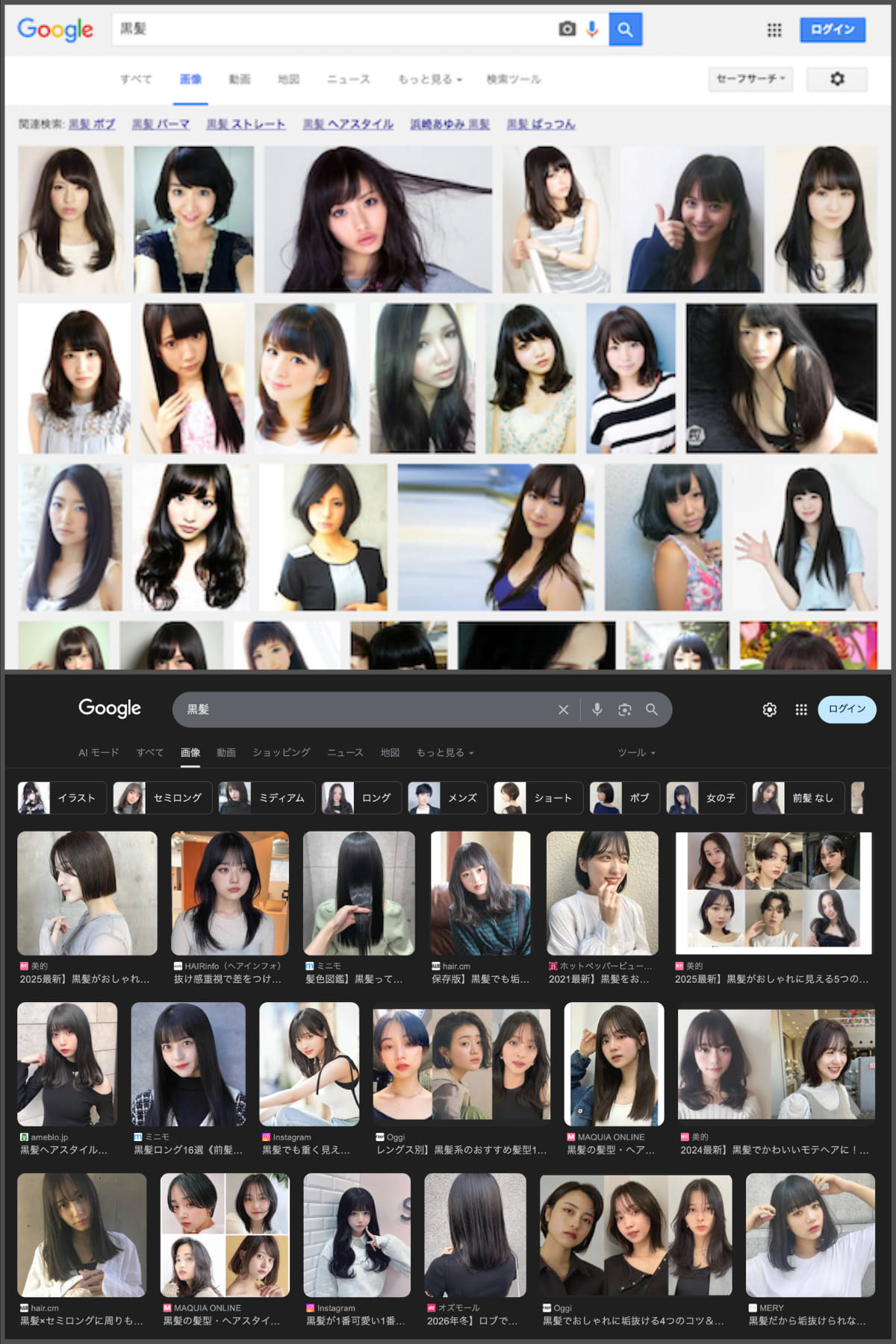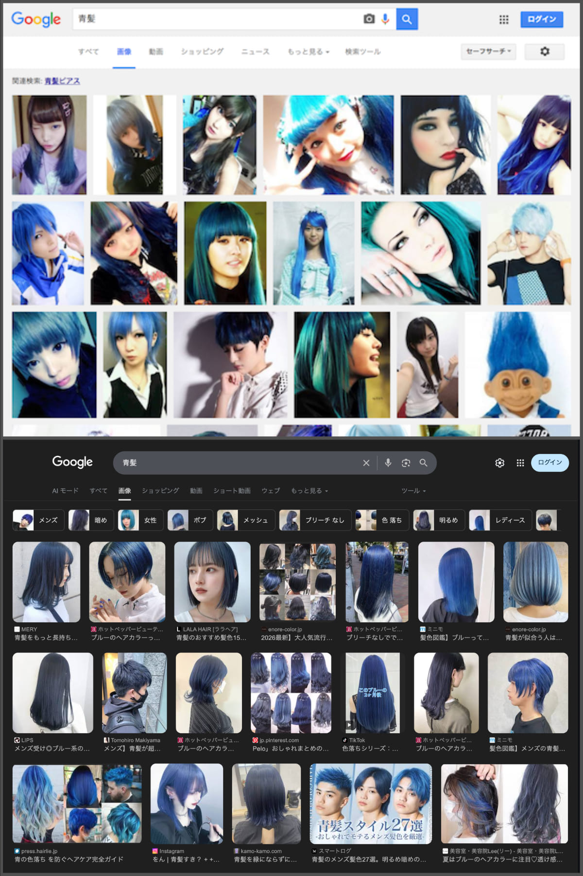 検索エンジンの能力の違い(検索意図のキャッチ能力)や文化の違い(美容室が個別事例を積極的にアップするようになったなど)もあるかも知れないですが、時代を感じる検索結果でした。