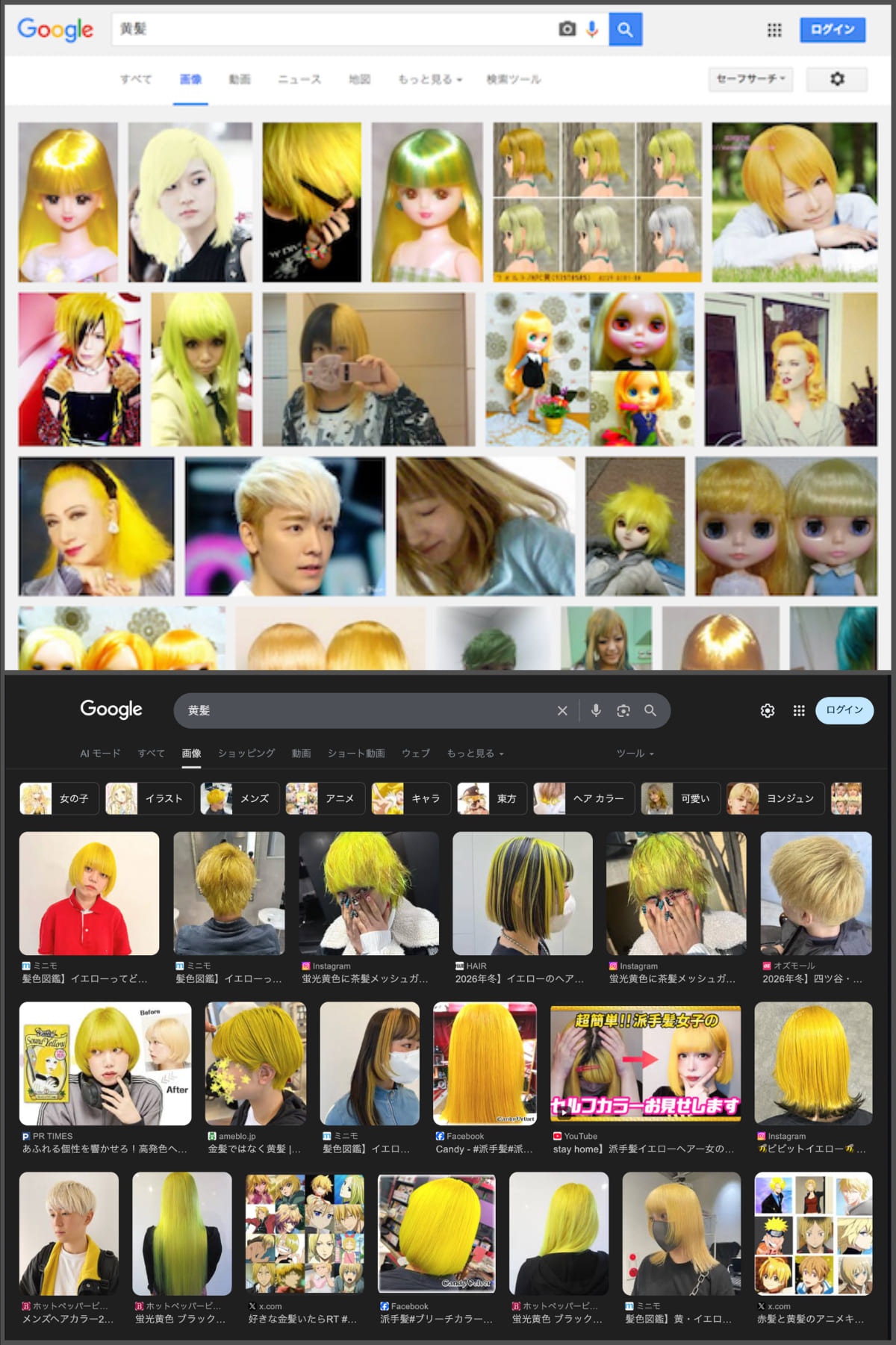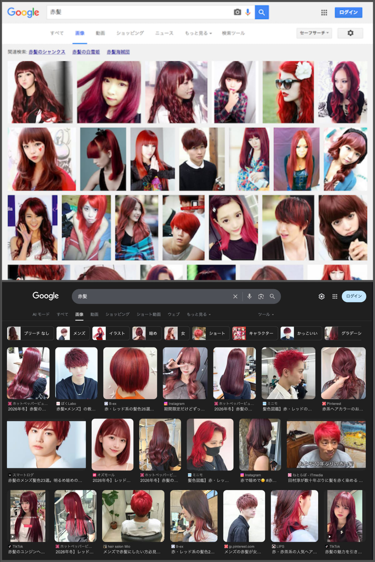2016年は個人写真やキャラが多そうに見えるのですが、2026年は美容室の写真が増えている。昔と比べるとさまざまなカラーの方が増えたので時代を感じる検索結果。