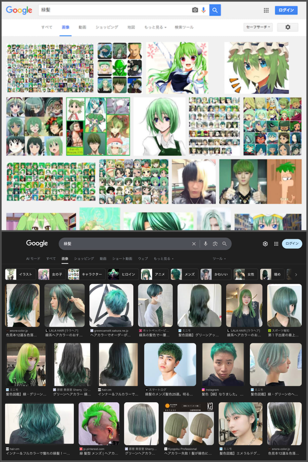 この時に「黒髪」「白髪」「青髪」「黄髪」「緑髪」という検索結果を載せていました。