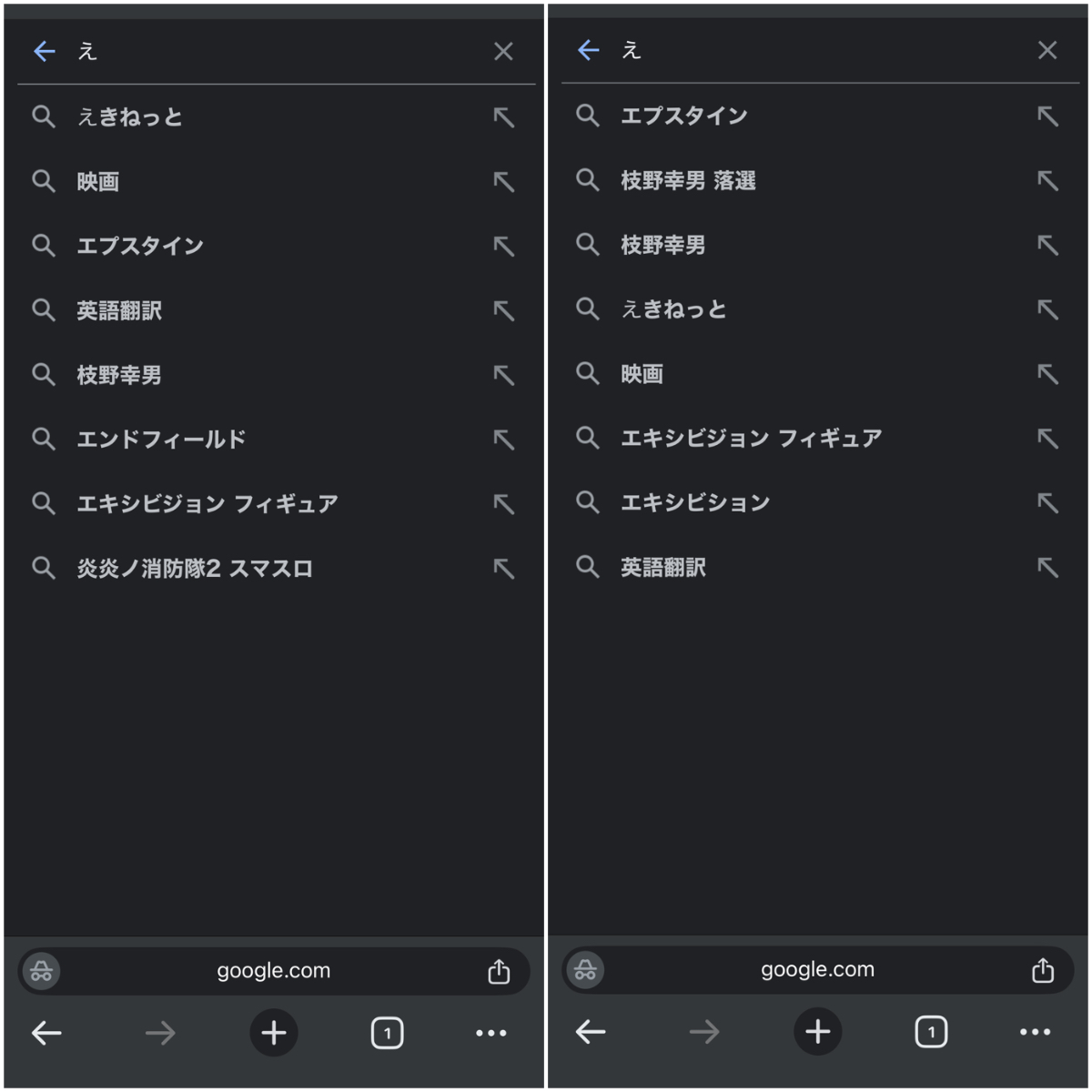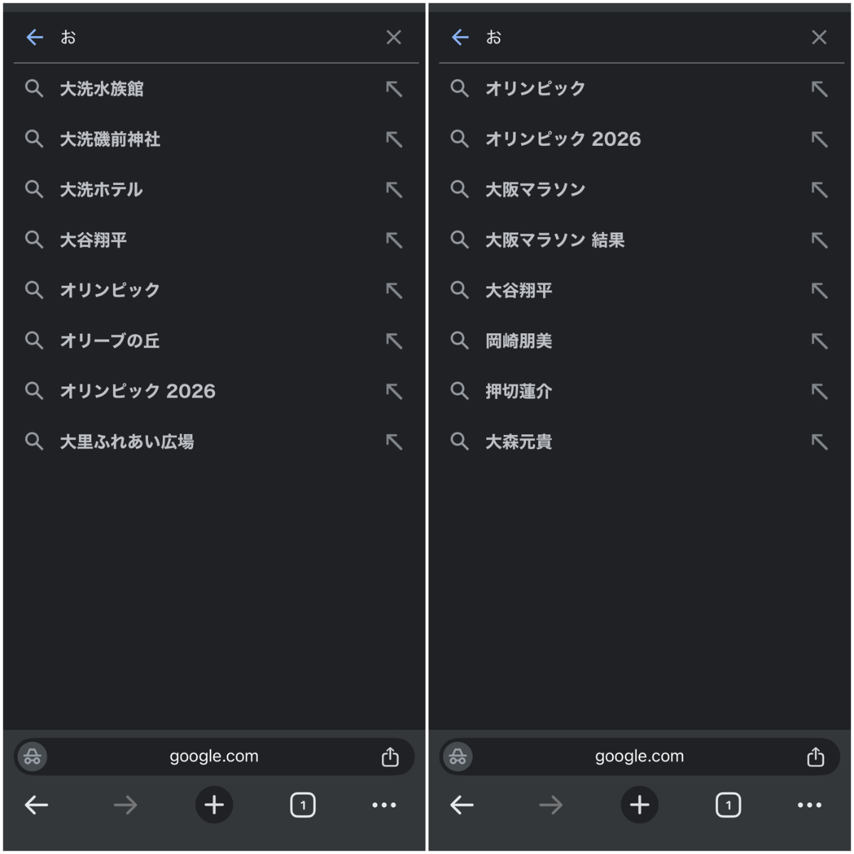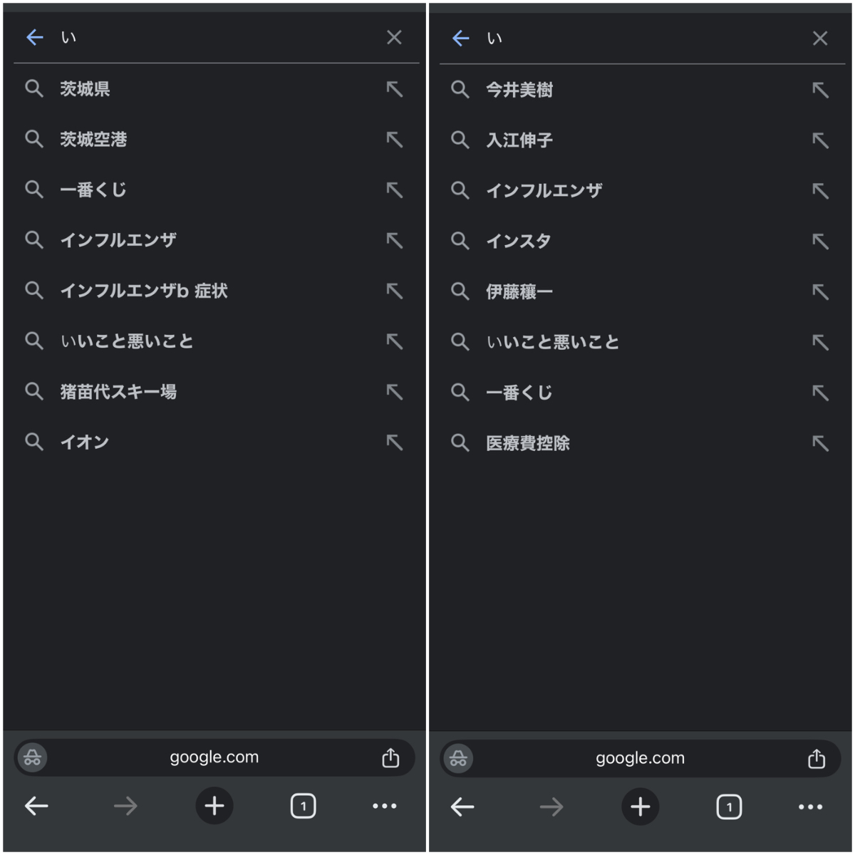 左が茨城県勝田のサジェスト、右が東京(の特定地域)。