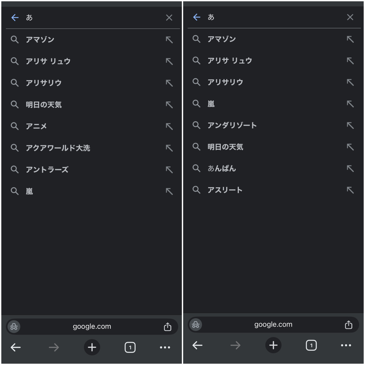 旅行に出た時の位置情報を利用してサジェストを記録しておくというものなのですが、その土地土地で検索クエリを変更すると違いが見つけにくくなるため「あいうえお」に限定して各地域のサジェストを記録していくことにしました。