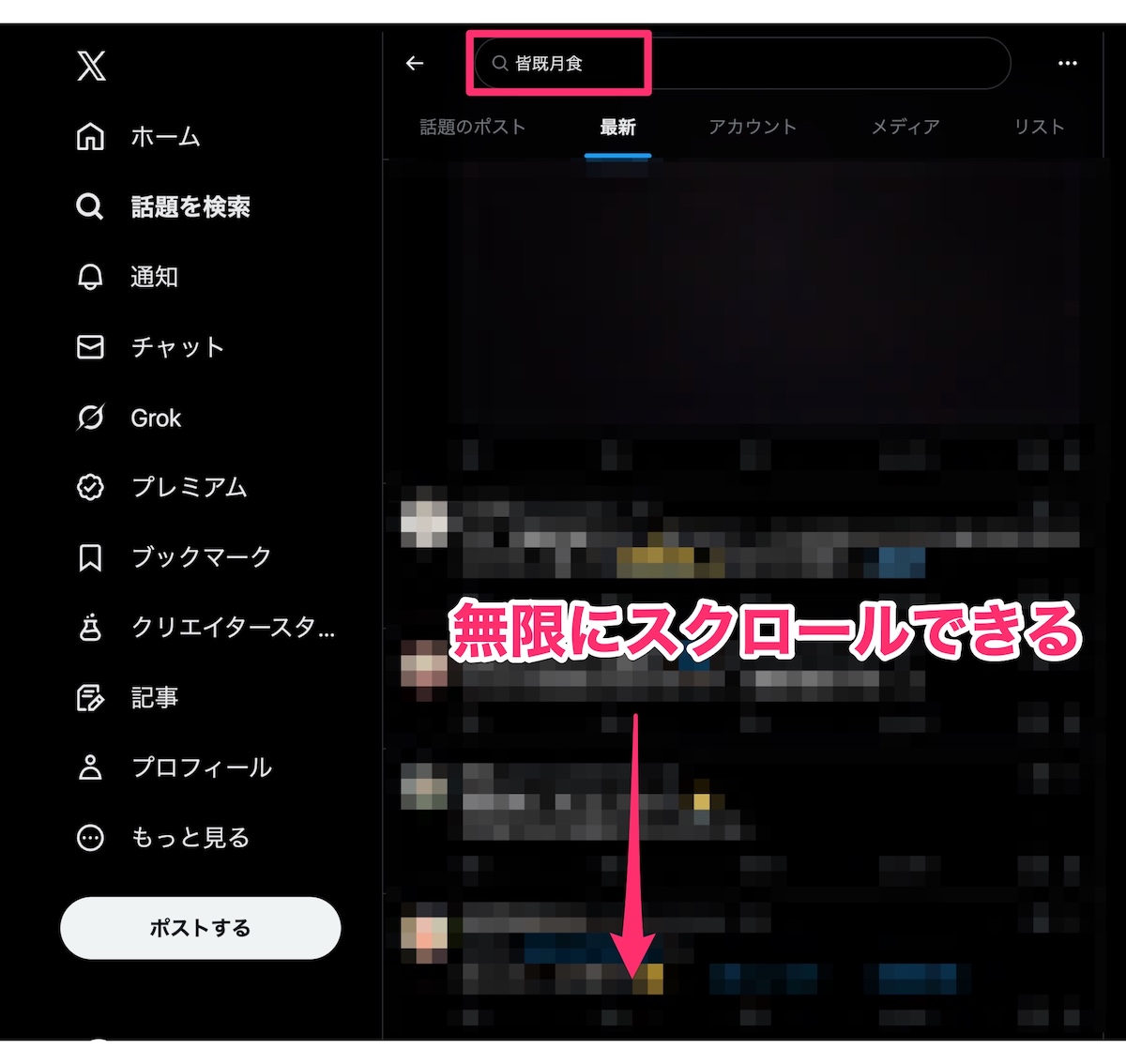 一方で「皆既月食」(3月3日現在)のようなトレンドキーワードにおいてはスクロールが延々と可能。どこかで制限はかかるかも知れないですが。