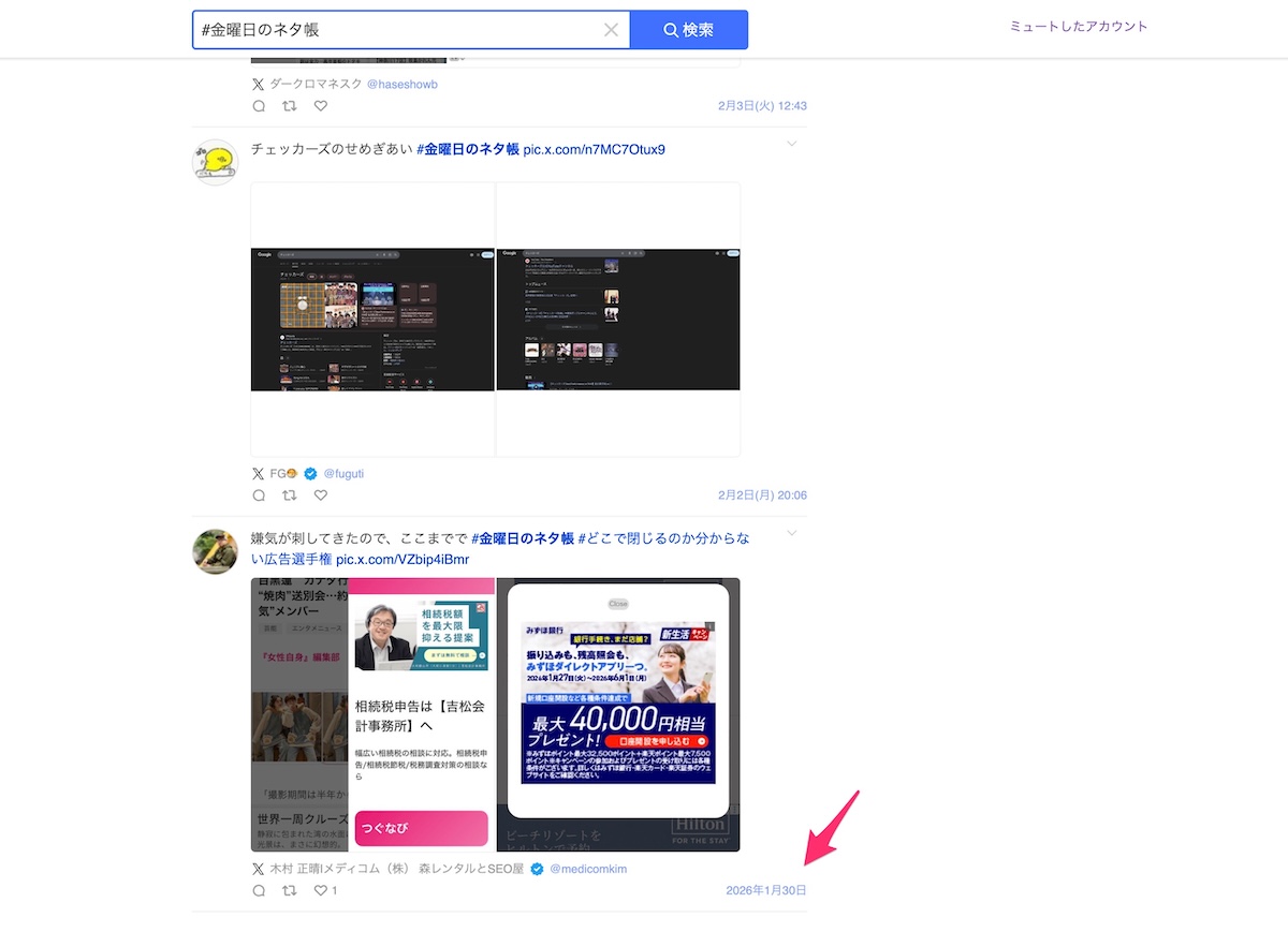 ちなみに上記POSTは遡って112件目・1月30日でした。直近1ヶ月縛りとかなのかな。