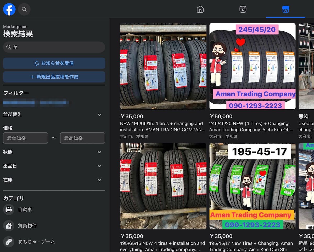 Facebookのマーケットプレイスで「草」と検索するとタイヤが出てくる。