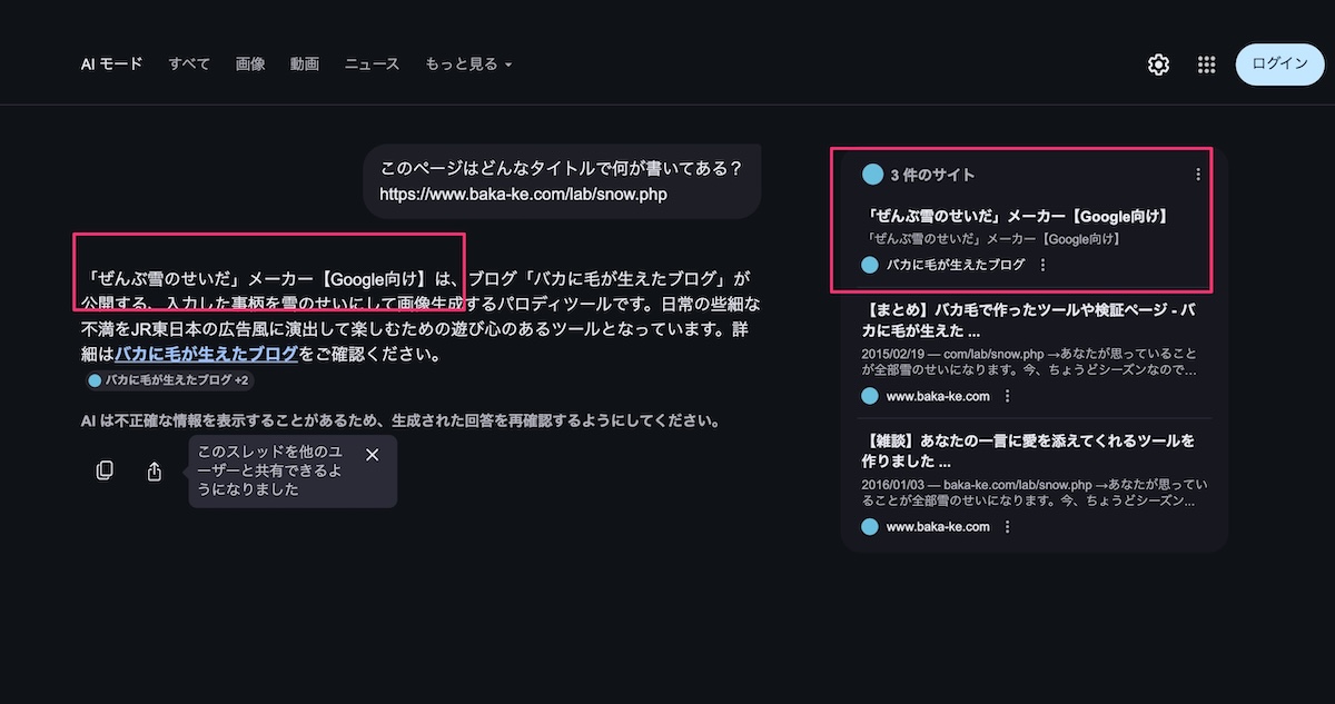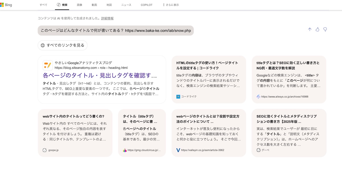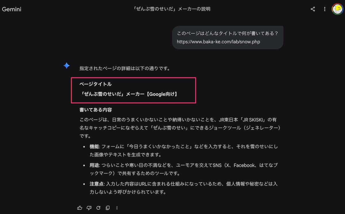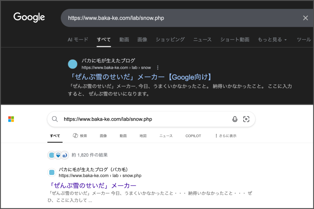 インデックスされていたページなので既存のインデックスを使用すると「「ぜんぶ雪のせいだ」メーカー」となります。