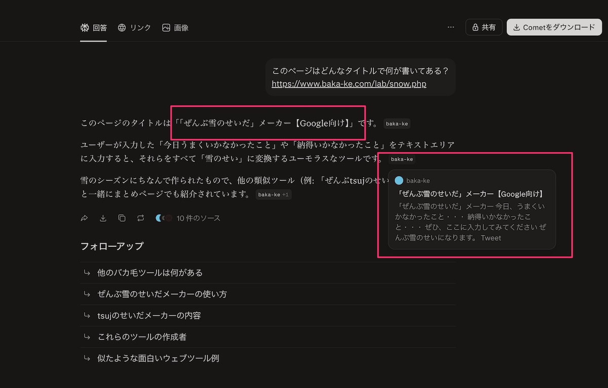 ログを見ている限りPerplexity-Userで来ているのだけど、Googleの検索結果を使用していそうです。