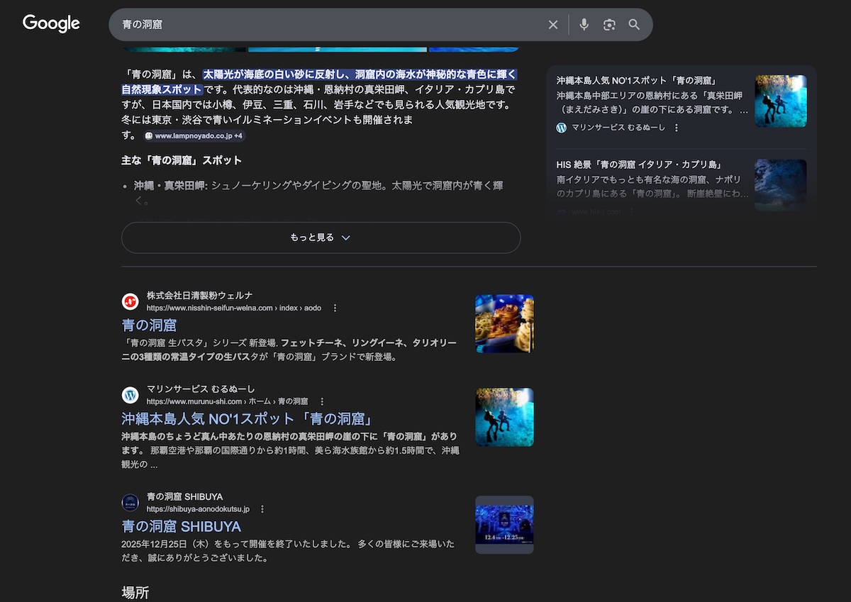 青の洞窟って沖縄の洞窟かなと思ったのですが、検索結果上ではパスタの素・沖縄・渋谷でせめぎ合っている。